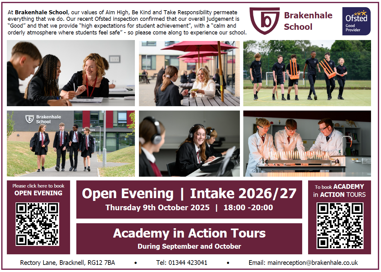 We are excited to invite you to our school tours and Open Evenings designed for parents of prospective students. A fantastic opportunity to explore our calm yet vibrant learning environment and envision your child's future at Brakenhale.