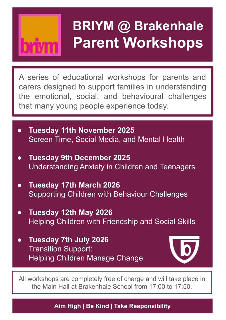 All workshops are completely free of charge and will take place in the Main Hall at Brakenhale School from 17:00 to 17:50.